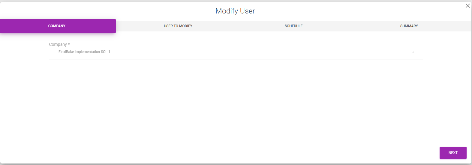 Choose the Company you want to modify the user for and click Next.