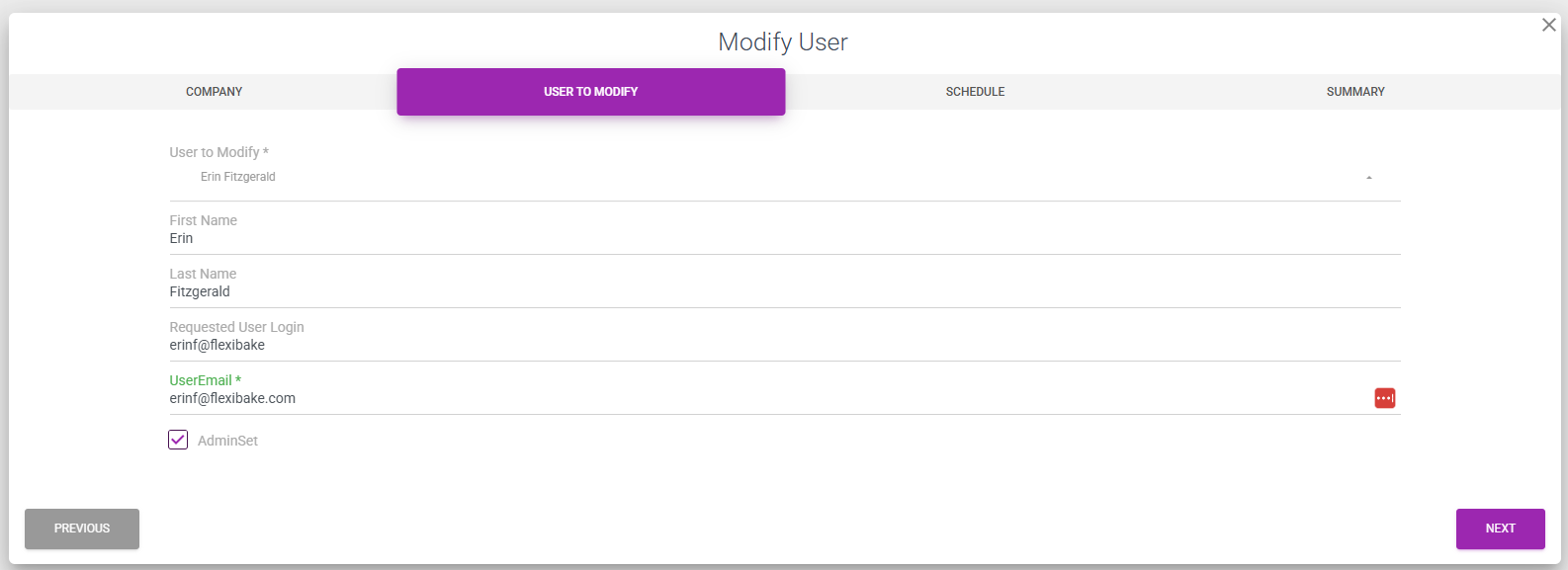 Select the User to Modify from the drop down. Fill out the user's First Name and Last Name and provide the new Requested Login and UserEmail. If this user is an Admin, check off AdminSet. Once all of the information is entered, press Next.